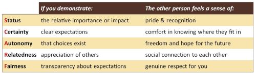 It is important for managers to be in touch with their direct reports as individuals and as employees. A coaching relationship allows for this. To be successful, the employee needs to feel psychologically safe when talking with their manager. According to David Rock’s SCARF model for collaborating with & influencing others, managers need to be mindful of these 5 domains: Status, Certainty, Autonomy, Relatedness, and Fairness .