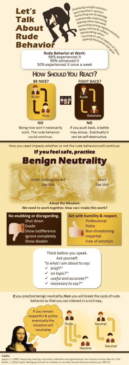 The mindset of Benign Neutrality is to remain interactive and civil with a rude person so that you can work together. Be professional, polite, non-threatening, impartial, and free of emotion. Do not shut down, avoid, display indifference, or ignore the other person completely. Act with humility and respect. This will not weaken your position but instead, it redirects the conversation to a position of: “We need to work together. What do we need to do to move this forward?”