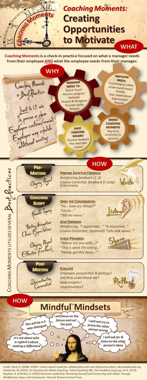 While keeping SCARF in the forefront of your mind, coaching moments are focused on what a manager needs from their employee AND what the employee needs from their manager. Sessions should be structured weekly; scheduled in advance; and limited to 15 minutes. It can be done in person or by phone. These can be done separately or as part of other one-to-one meetings – as long as a portion of the time is devoted to what employees need. Additionally, both parties should be accountable for holding these meetings: employees should be encouraged to confirm and remind the manager of coaching moments. They should also be encouraged to schedule additional coaching moments when needed.