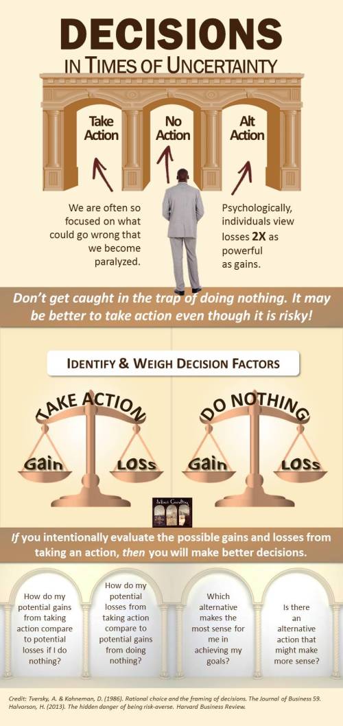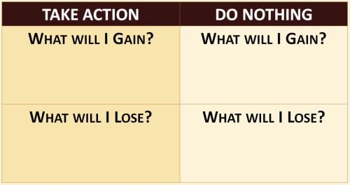 To avoid getting caught up in the trap of doing nothing, determine the risk. When considering an action in which you are unsure of what the outcome might be, identify decision factors and assess each factor’s relative importance. Explore the potential gains and losses of taking an action as well as the gains and losses from doing nothing. Make a conscious effort to identify, analyze, and rate the alternatives between: