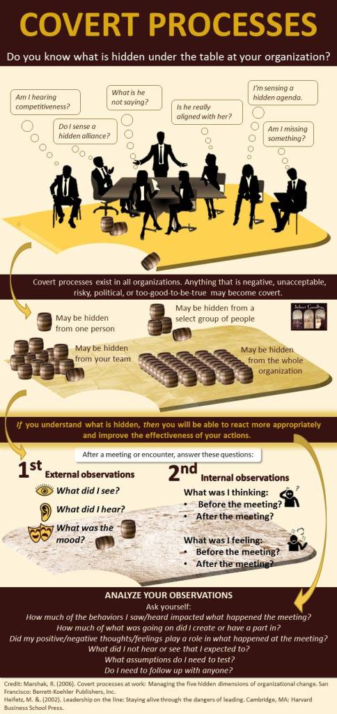 A covert process is one that is hidden or under the table. According to Bob Marshak’s seminal work, it can be hidden from just you, a group of people, or an entire organization. Because all significant change involves covert processes, it is critical to consider what is covert and who it is hidden from. When you are aware of what is hidden, you can better understand the intentions before you become surprised. If you understand the nature of covert processes and recognize them, you can plan and act appropriately – especially before it might be too late.